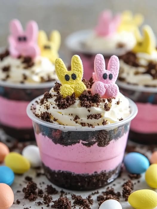A fun and festive no-bake dessert made with layers of creamy pudding, crushed cookies, and topped with adorable Easter-themed decorations like Peeps, candy eggs, and gummy worms! Perfect for kids and adults alike.