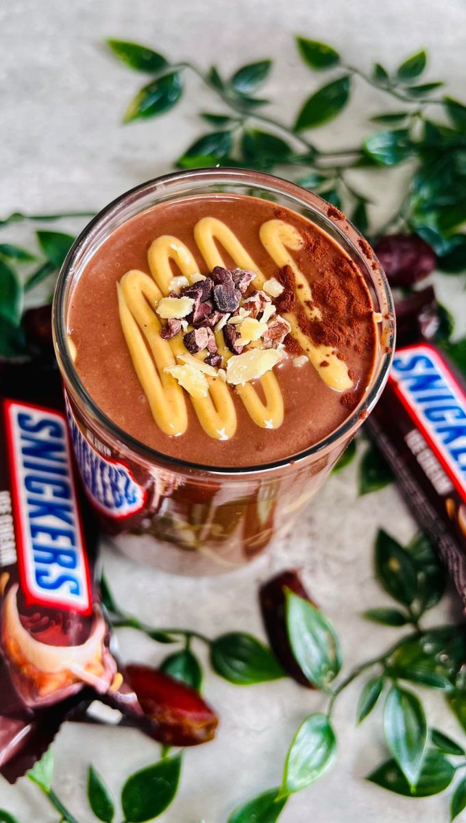 Whip up this easy healthy snickers smoothie for a guilt-free treat! This smoothie blends dates, peanut butter, and cocoa powder to recreate the decadent taste of a Snickers bar in a nutritious way.