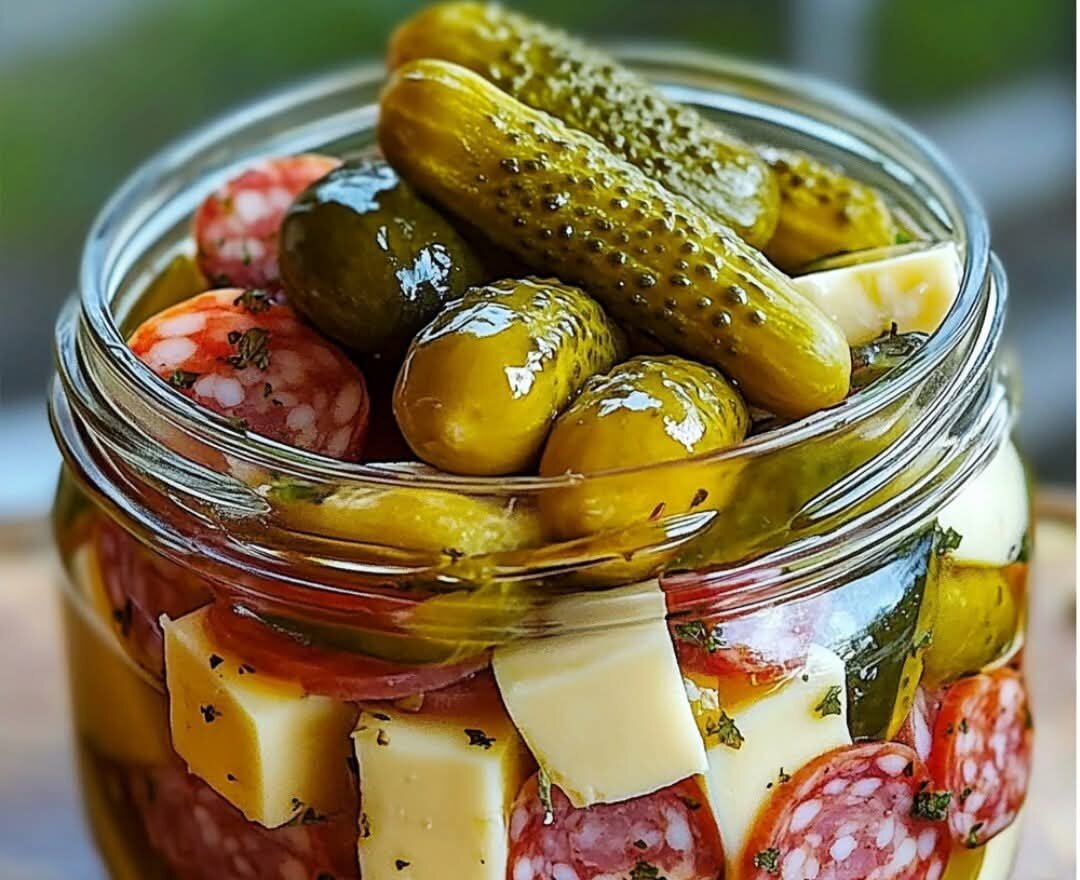 Easy Marinated Cheese Appetizer with Salami & Pickles