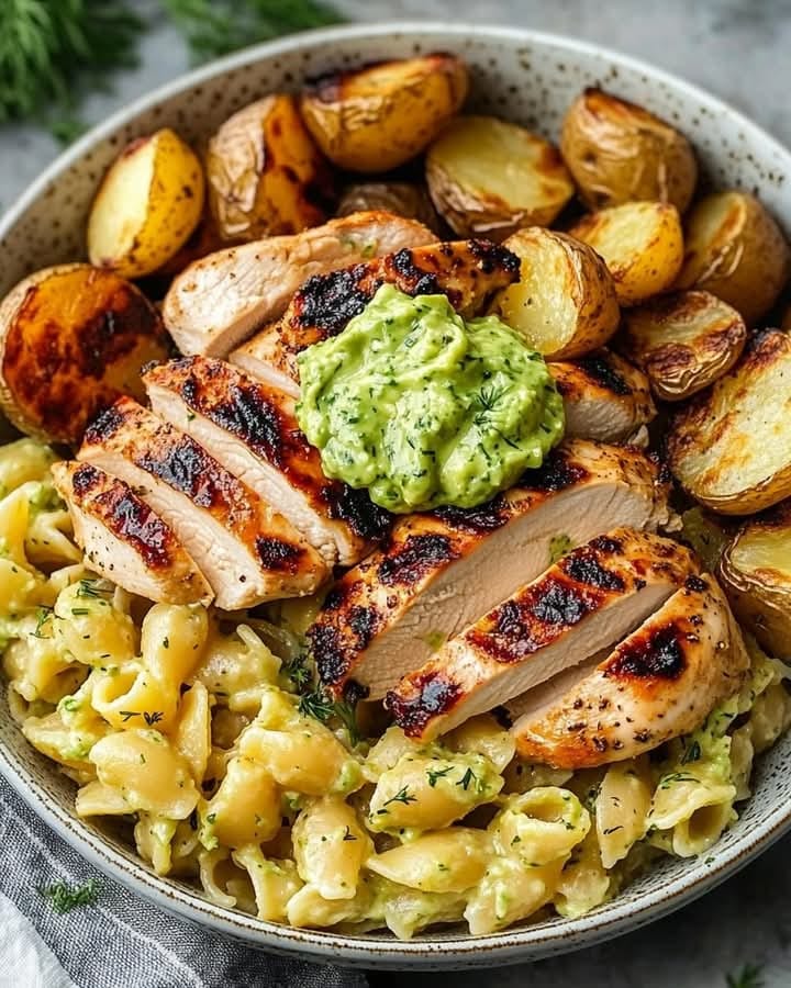 This Epic Creamy Chicken Pasta Bowl with Roasted Potatoes & Avocado Herb Sauce is a flavor-packed meal that satisfies every craving—from creamy comfort to herby freshness and crispy bites. It’s a crowd-pleaser with customizable parts that suit many dietary needs. Try it once, and it might just become a regular on your weekly menu!