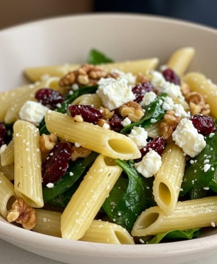 In a large bowl, combine the cooled rigatoni, feta, cranberries, walnuts, red onion, spinach, and cucumber.
