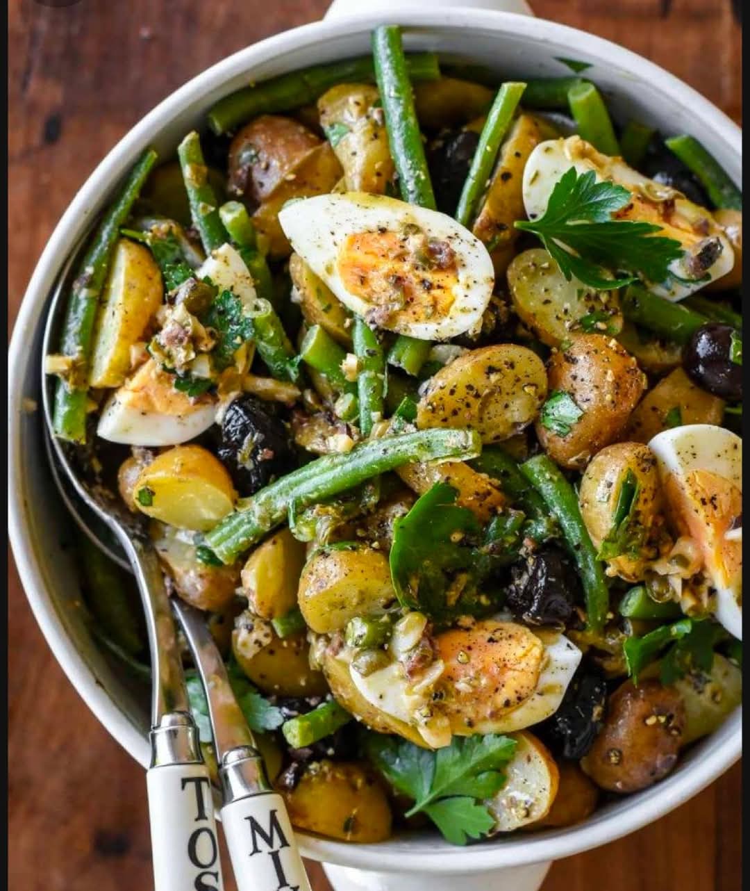 Step 4 – In a serving bowl, add the herbs and mix with about half the amount of the vinaigrette. Add the cooked potatoes, green beans and olives and toss to combine. Top with the egg quarters and drizzle the remaining dressing over top (you may use all the rest of the dressing, or less). Season to taste, if needed.