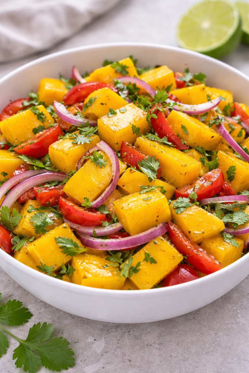 This Fresh Mango Salad with Lime & Herbs is a bright, juicy, and refreshing dish that perfectly balances sweet, tangy, and savoury flavours. Ripe mango chunks are paired with crisp vegetables, fresh herbs, and a zesty lime dressing, creating a light yet flavourful salad—perfect for summer meals, BBQs, or a healthy side.
