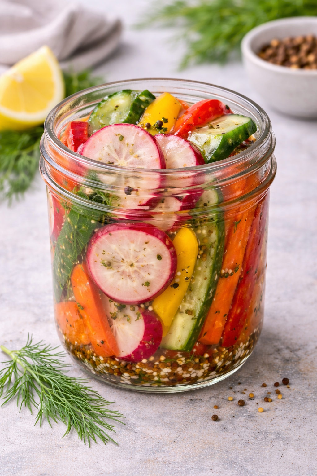 This colorful fridge pickled vegetable mix is a crisp, tangy, and refreshing combination of radishes, cucumbers, carrots, and peppers soaked in a flavorful vinegar brine. Stored in a small jar, it’s perfect for snacking, adding to sandwiches, or serving as a zesty side. No canning required—just quick, easy, and delicious pickling right in your fridge.
