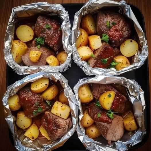 - To assemble the foil packets, spread out four sheets of foil that are at least 12 by 12 inches. Distribute the potatoes and steak equally among the foil sheets’ centres. Put some butter cubes on top, then cover the steak and potatoes with foil, making sure it seals tightly.
