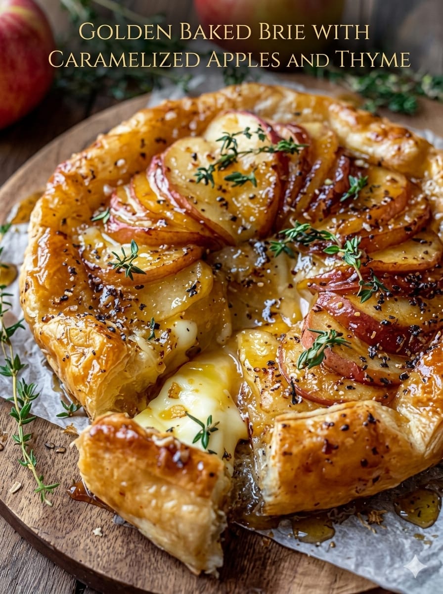 Golden Baked Brie with Caramelized Apples and Thyme is a warm, indulgent appetizer that brings together creamy cheese, sweet fruit, and flaky pastry in perfect harmony. It’s simple to prepare yet impressive enough for special occasions. Whether served at a holiday table or a cozy gathering, this dish delivers elegance, comfort, and unforgettable flavor in every bite.