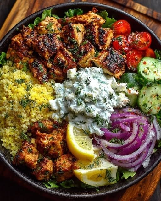 This Greek Chicken Gyro Bowl with Spicy Tzatziki Feta brings all the bold, fresh flavors of a classic gyro into a simple, satisfying bowl. Juicy lemon-marinated chicken, crisp vegetables, fluffy grains, and a creamy feta-spiked tzatziki with a little heat make this meal both comforting and refreshing. It’s the kind of recipe that feels restaurant-worthy but is easy enough for weeknights. Perfect for meal prep, family dinners, or anytime you want something hearty without feeling heavy, this bowl is balanced, colorful, and packed with Mediterranean flavor.