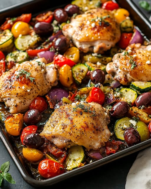 Place the seasoned veggies on a sheet pan and nestle the chicken thighs among the vegetables. Drizzle the chicken with a little extra olive oil and season with additional salt and pepper.