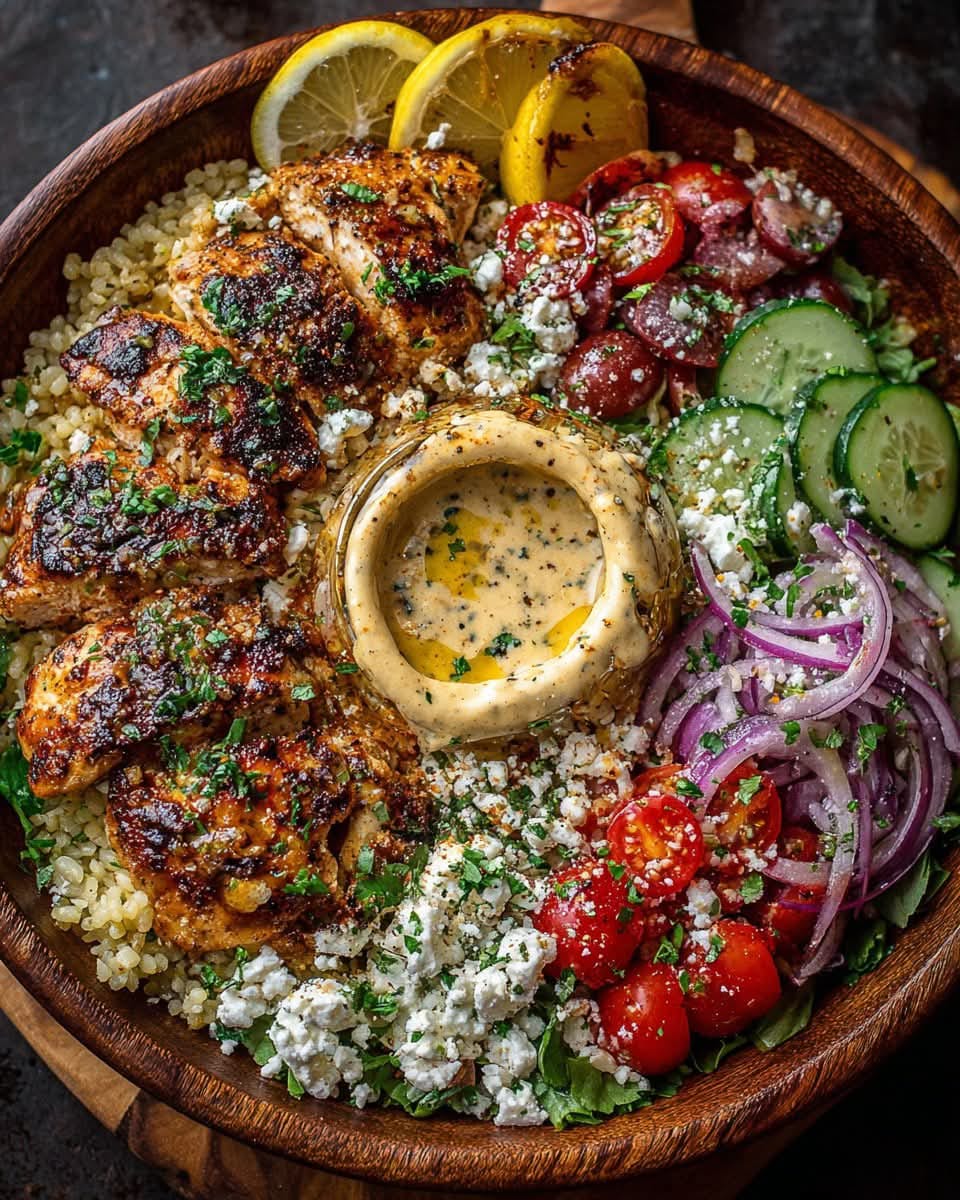 Start with a base of grains. Add chicken, vegetables, and toppings like feta and olives.