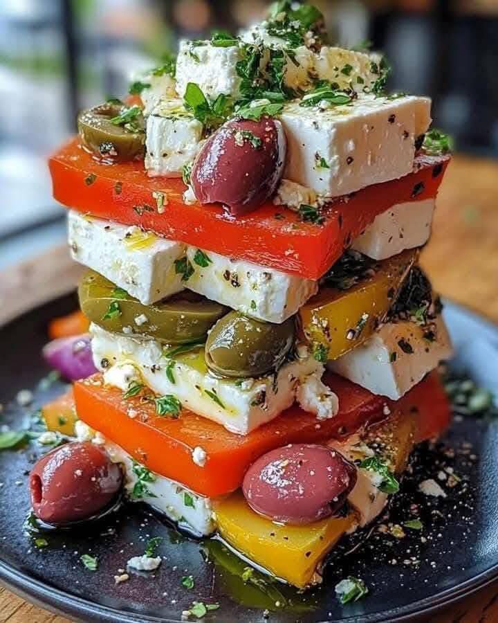 A colorful, crisp, and refreshing salad layered with Mediterranean favorites like feta, olives, and fresh veggies—finished with a zesty homemade vinaigrette. Perfect as a side or main dish!