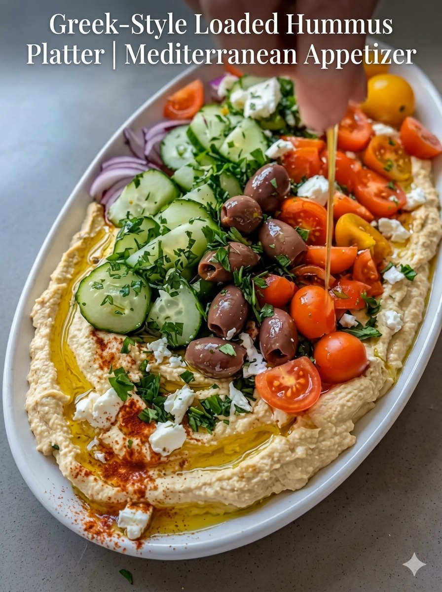 This Greek-Style Loaded Hummus Platter is a vibrant, shareable appetizer that turns a simple dip into a stunning centerpiece. Creamy hummus is spread onto a platter and topped with a colorful mix of fresh vegetables, briny olives, tangy feta, and aromatic herbs. Every bite delivers a balance of creamy, crunchy, salty, and zesty flavors. It’s perfect for entertaining, light snacking, or even a casual meal when paired with warm pita or flatbread.