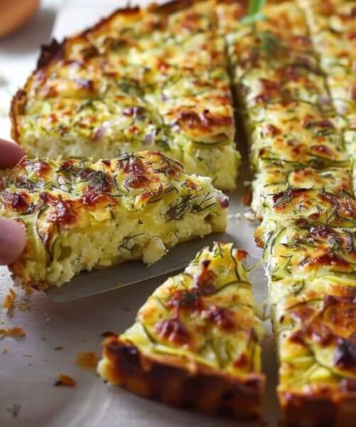 Bake the zucchini pie for about 40-50 minutes, or until golden brown on top and firm in the center. Allow it to cool for a few minutes before serving.