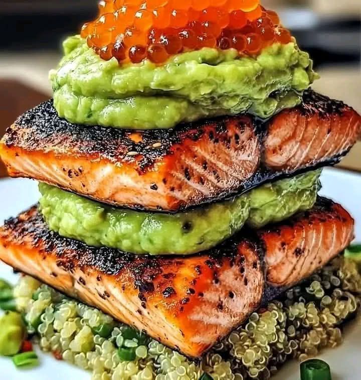 This Grilled Salmon and Quinoa Stack is a fresh and flavorful dish packed with Mediterranean ingredients like olive oil, garlic, lemon, and fresh herbs. The creamy avocado sauce adds a delicious, healthy twist while keeping it light and nutritious!
