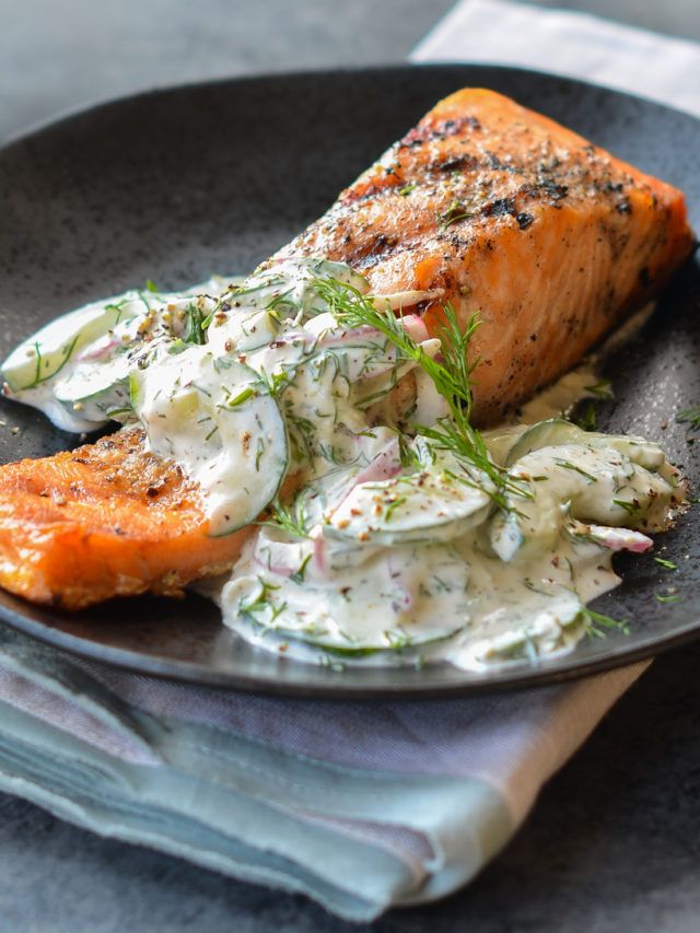 Serve grilled salmon alongside cucumber salad immediately.