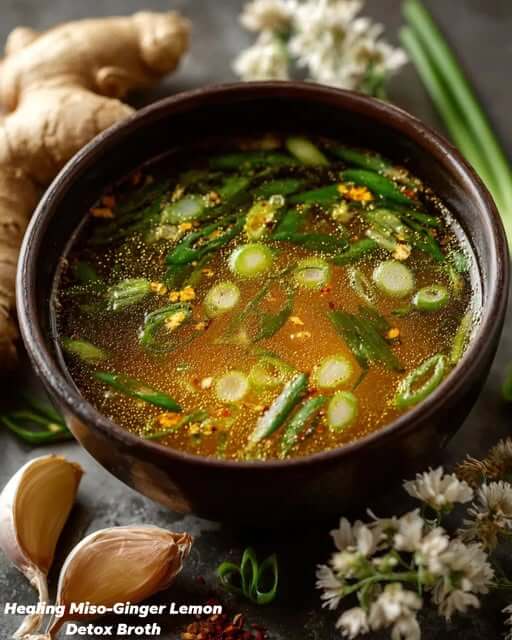 This Healing Miso-Ginger Lemon Detox Broth is a light yet deeply nourishing drink designed to warm the body, support digestion, and gently cleanse from the inside out. Inspired by traditional Japanese miso soup and enhanced with powerful anti-inflammatory ingredients like ginger, turmeric, garlic, and lemon, this broth is ideal for mornings, fasting days, or whenever your body needs calm and balance. It’s easy to make, deeply aromatic, and incredibly restorative.