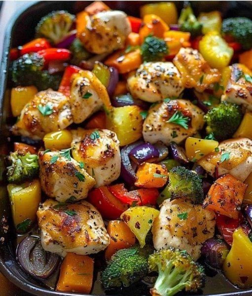 Chicken is done when internal temp reaches 165°F (74°C) and veggies are fork-tender with light browning.