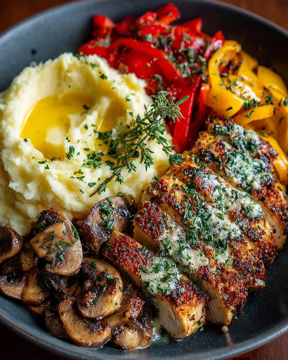 Herb-Crusted Chicken with Sautéed Peppers & Mushrooms + Creamy Mashed Potatoes