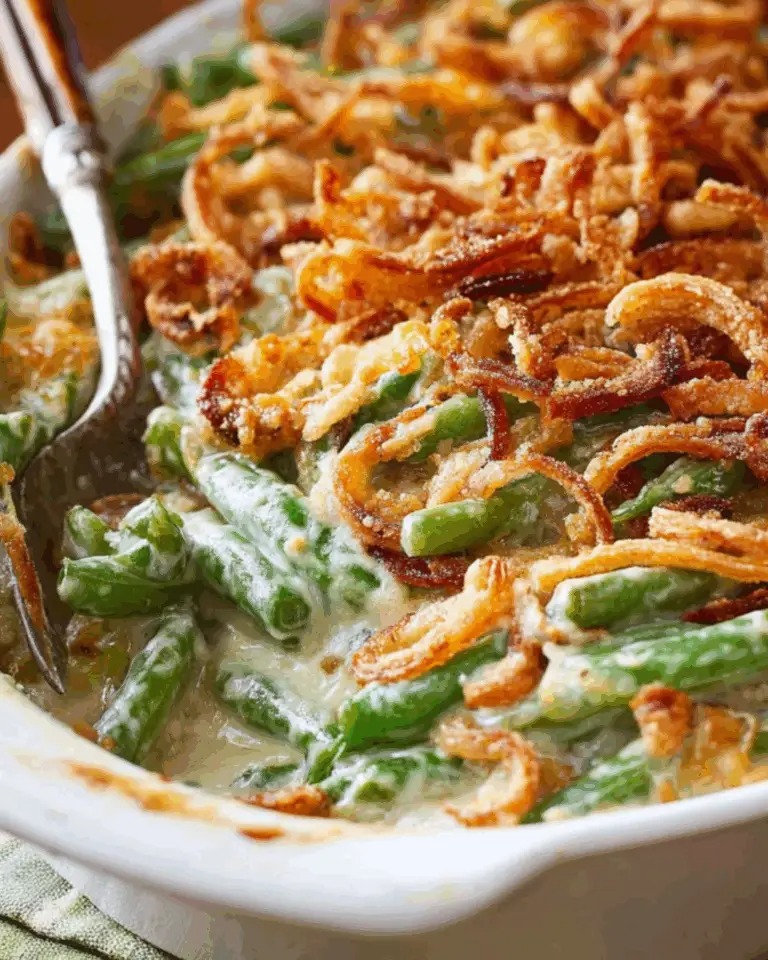 Homemade Creamy & Cheesy Green Bean Casserole is a comforting, classic side dish made richer and more flavorful with a from-scratch creamy sauce and plenty of melted cheese. Tender green beans are baked in a savory, velvety mixture and topped with crispy onions for irresistible texture and crunch. Unlike traditional versions made with canned soup, this homemade recipe delivers deeper flavor using fresh ingredients, garlic, and a creamy cheese base. It’s perfect for holiday tables, family dinners, or potlucks because it’s easy to prepare and always a crowd favorite. The balance of creamy sauce, crisp topping, and perfectly cooked beans makes each bite satisfying and nostalgic while still feeling fresh and homemade.