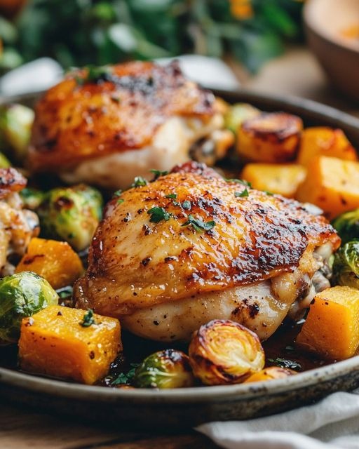 In conclusion Honey Garlic Roasted Chicken Thighs with Butternut Squash & Brussels Sprouts is a flavorful well-balanced dish that brings together savory sweet and garlicky goodness in one pan, The crispy juicy chicken pairs perfectly with the caramelized butternut squash and Brussels sprouts creating a comforting yet wholesome meal. This easy-to-make dish is perfect for weeknight dinners or special gatherings offering a delicious combination of textures and flavors. Serve it with a side of rice quinoa or crusty bread for a complete and satisfying meal. Enjoy!