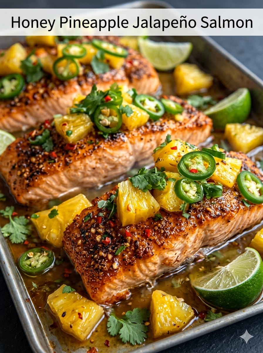 Honey pineapple jalapeño salmon is a sweet, spicy, and tangy dish that brings bold tropical flavors to a simple baked or pan-seared salmon. The honey glaze caramelizes beautifully while the pineapple adds natural sweetness and juiciness. Jalapeños bring a gentle heat that balances everything out without overpowering the fish. It’s fresh, vibrant, and surprisingly easy to make, making it perfect for weeknight dinners or a light, flavorful meal that still feels special.