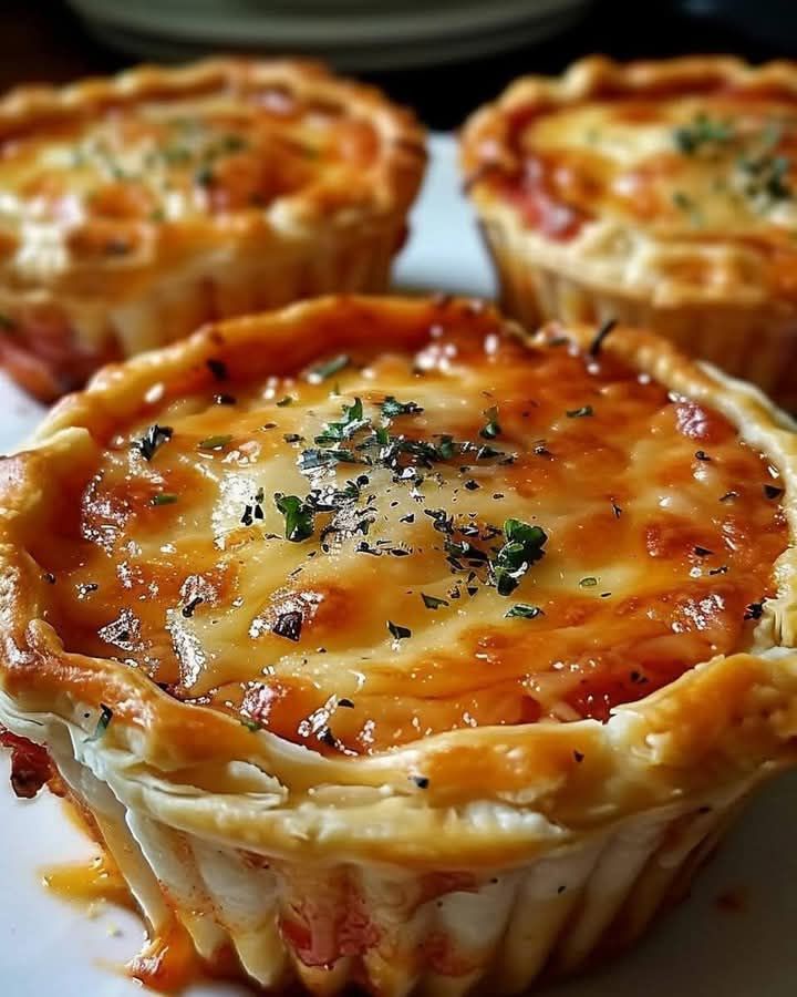 Enjoy your Individual Cheesy Pizza Pot Pies—crispy on the outside, gooey and cheesy inside!