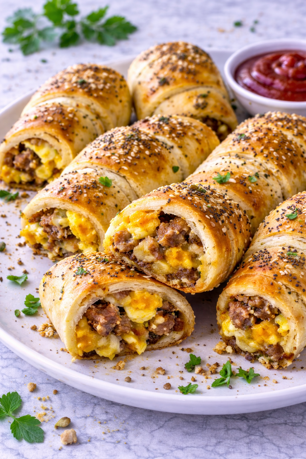 These Cheesy Sausage Egg Breakfast Roll-Ups are the ultimate grab-and-go breakfast—flaky, golden pastry wrapped around savory sausage, fluffy scrambled eggs, and melty cheese. Topped with everything bagel seasoning, they’re crispy on the outside and rich, cheesy, and satisfying on the inside. Perfect for busy mornings, brunch, or meal prep!