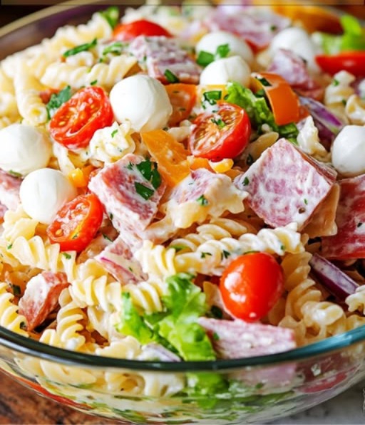 - In a separate very large bowl, add in 1 pound rotini pasta (cooked until al dente); 2 (8 ounce) containers marinated mozzarella cheese balls in oil (sliced into quarters); 5-6 peperoncini peppers (sliced in rings); 10 ounce container cherry tomatoes (cut in half); 1 cup pickled red onion; 10 slices deli Genoa salami (cut into chunks); 8 slices deli ham (cut into chunks) and 20 slices pepperoni (cut into quarters) (hold off on the lettuce for now).