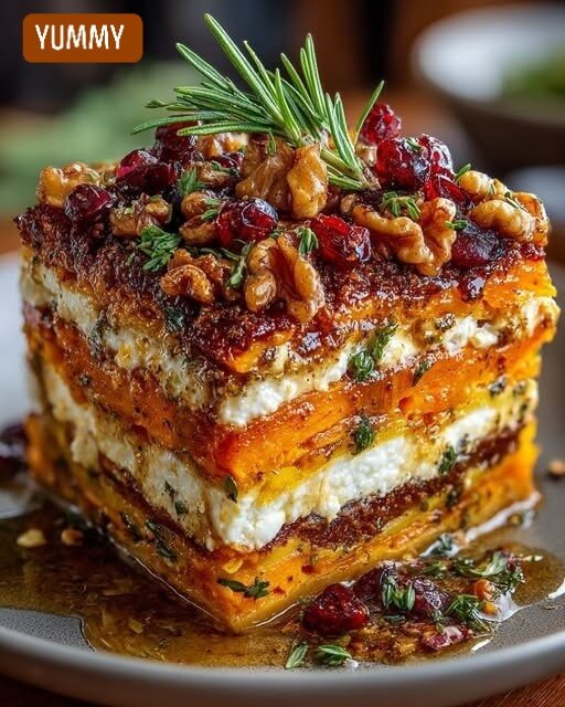 Layered Sweet Potato, Butternut Squash & Carrot Lasagna with Feta, Walnuts & Cranberry-Honey Glaze