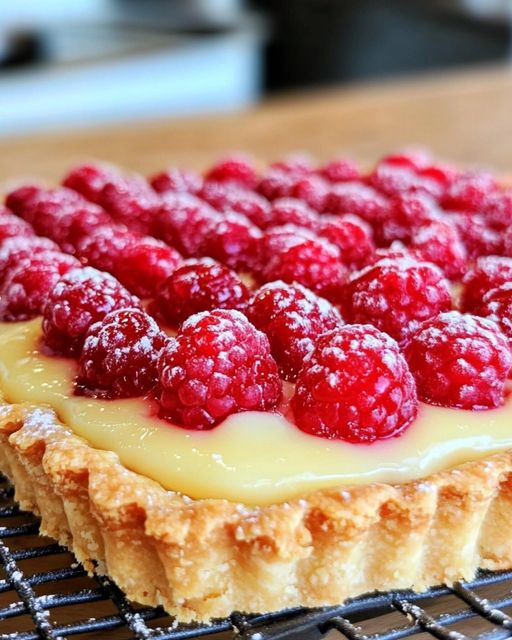 Cover the chilled pastry shell with the lemon cheesecake filling. Place a layer of hot raspberry jam over the raspberries.