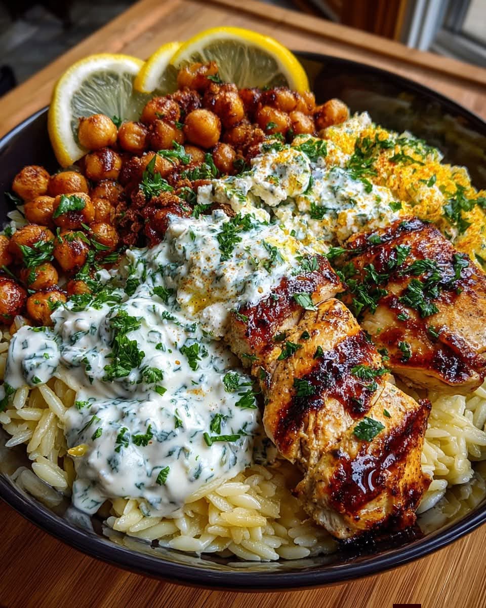 Lemon Dijon Chicken Orzo Bowl with Garlic Feta Yogurt Sauce, Olive Mix & Chickpeas