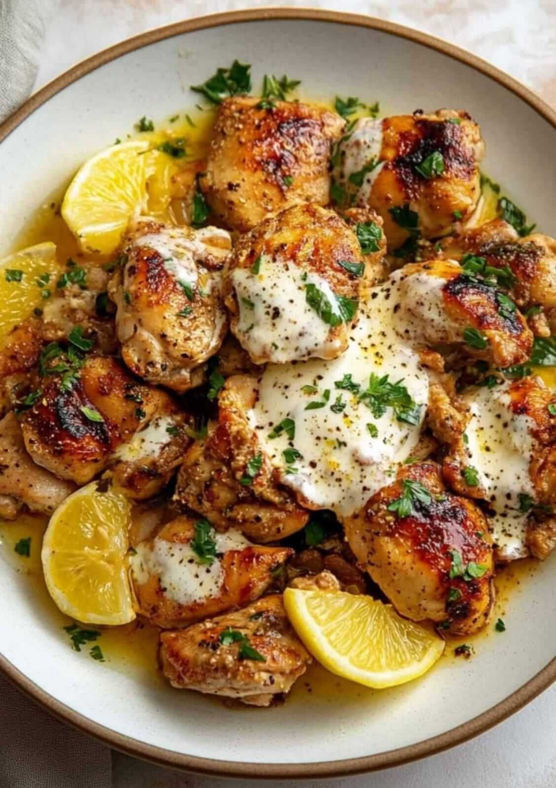 The combination of simple ingredients—lemon, garlic, olive oil, and herbs—creates a bright, savory dish that pairs beautifully with a variety of sides. Optional yogurt or sour cream sauce adds creaminess, while fresh parsley enhances presentation and flavor. This Lemon‑Garlic Chicken is both elegant and approachable, offering a delicious and nutritious meal for any occasion.