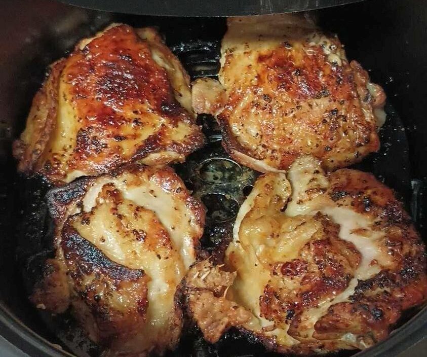 Cook the thighs in the preheated air fryer for approximately 25 to 30 minutes, turning them over halfway through. - The size of your chicken thighs and the particular type of your air fryer might affect how long they take to cook. Make sure the chicken’s internal temperature reaches 165°F (74°C).