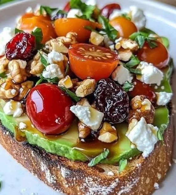 This is not your average avocado toast — it is a flavor-packed gourmet version that is perfect for breakfast brunch or a light lunch. Creamy avocado meets juicy cherry tomatoes tangy goat cheese crunchy walnuts sweet dried cranberries and a luscious balsamic glaze all piled on crispy rustic sourdough bread. Fresh herbs top it off for a bright fresh finish. Each bite is a delicious mix of creamy crunchy sweet tangy and savory. It is quick to make beautiful to serve and totally satisfying!