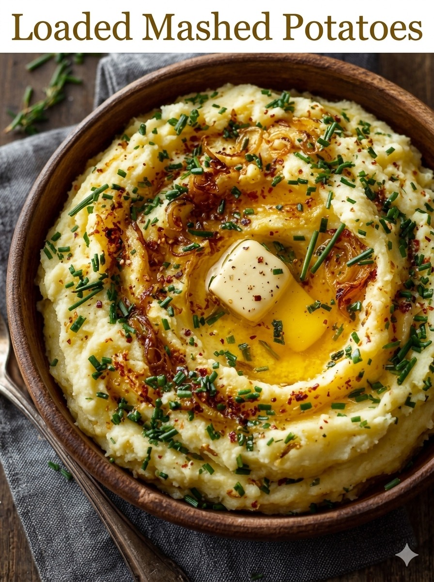 Loaded Mashed Potatoes take a classic comfort food and elevate it into something rich, indulgent, and deeply satisfying. Creamy, buttery potatoes are enhanced with layers of flavor from garlic, caramelized onions, and tangy dairy additions like sour cream or cream cheese. Finished with fresh chives, a pat of melting butter, and a hint of spice, this dish is perfect for holidays, family dinners, or anytime you want a side that steals the spotlight.