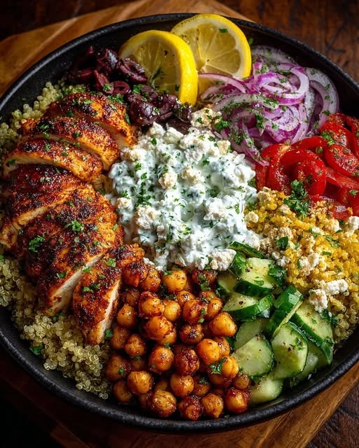 This loaded Mediterranean chicken power bowl is built to be satisfying, balanced, and full of real flavor. Tender, seasoned chicken is paired with hearty grains, crisp vegetables, creamy tzatziki, and salty feta for a bowl that feels fresh yet filling. Every component brings something important to the table. The chicken delivers protein and warmth, the vegetables add crunch and brightness, and the sauces tie everything together. It is the kind of meal that works just as well for a busy weekday lunch as it does for a relaxed dinner. Flexible, nourishing, and colorful, this bowl earns its place in any regular rotation.