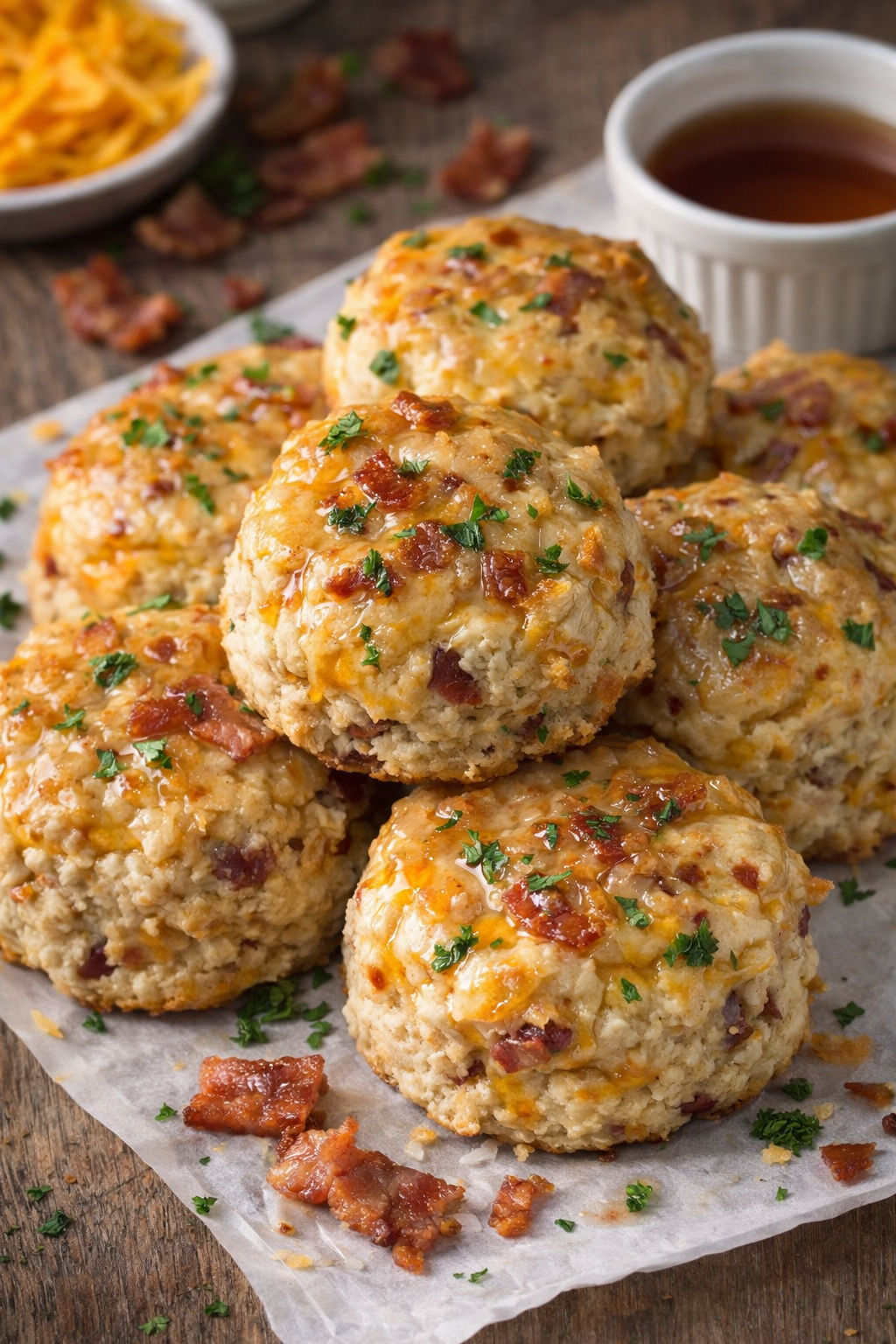 These Maple Bacon Cheddar Biscuits are the perfect blend of sweet, savoury, and cheesy goodness. Fluffy, buttery biscuits are packed with crispy bacon and sharp cheddar, then finished with a light drizzle of maple syrup for that irresistible sweet-savoury combo. Perfect for breakfast, brunch, or a cozy side dish!