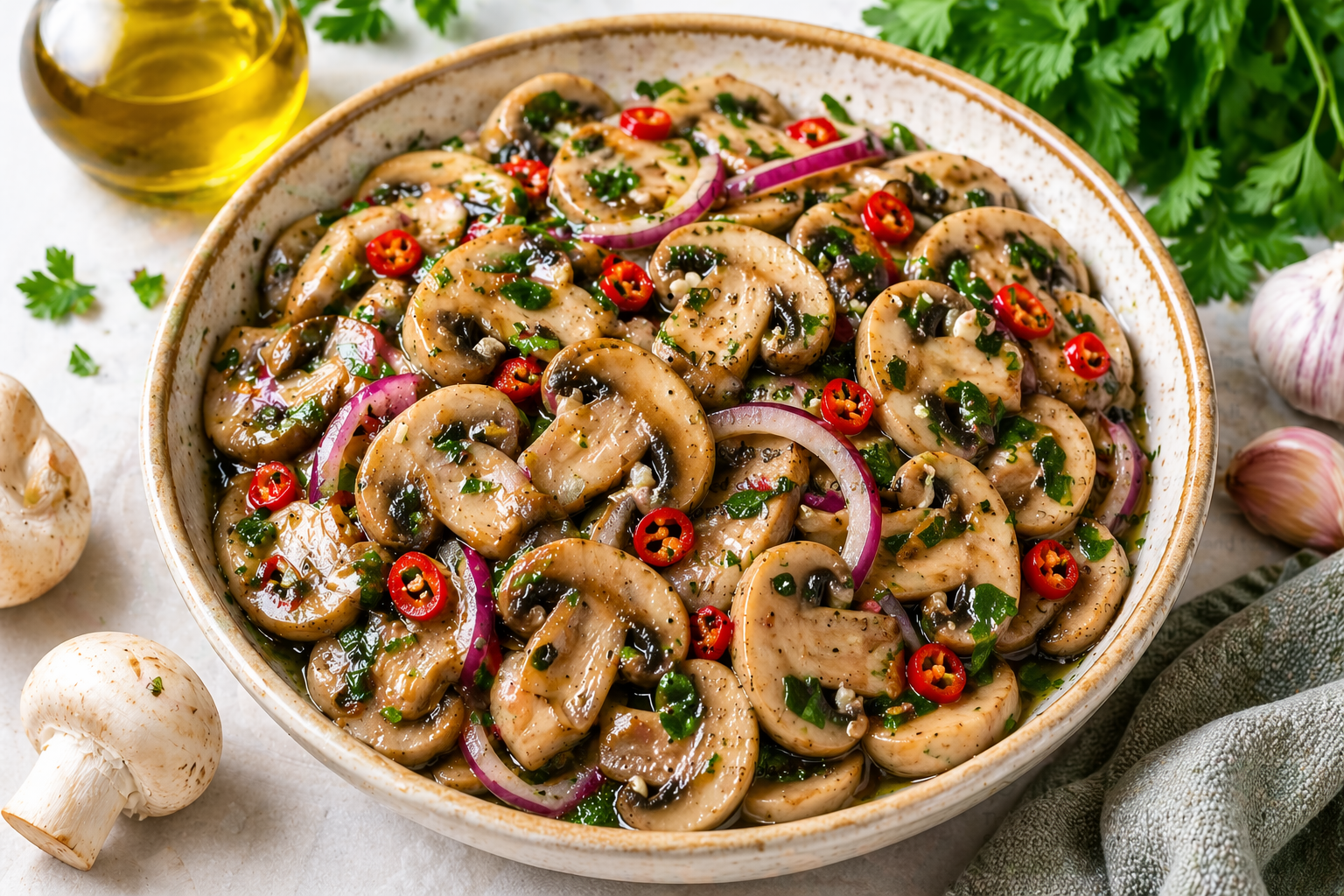 This marinated mushroom salad is a light, tangy, and refreshing dish made with tender mushrooms soaked in a flavourful vinaigrette. It’s perfect as a side dish, appetizer, or even a healthy snack. The longer it marinates, the more the flavours deepen, making it ideal for make-ahead meals.