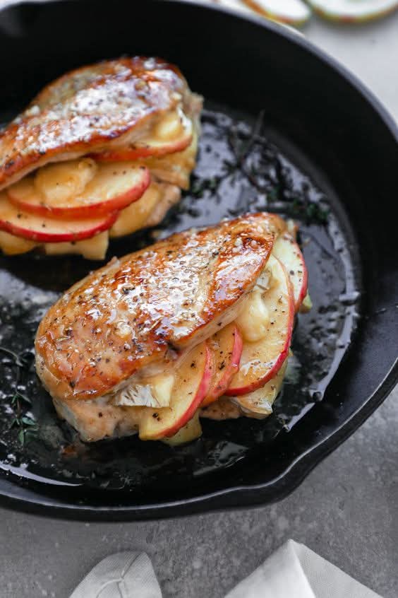 Stuff each breast with a few slices of apple, some garlic, and pieces of brie. Press the chicken closed. If needed, secure with toothpicks.