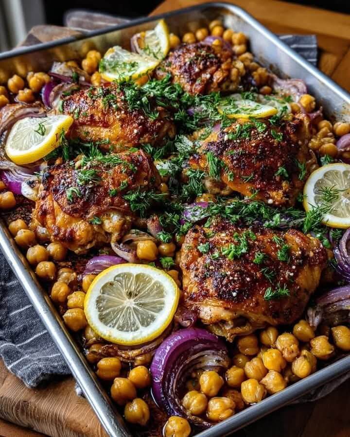 This Mediterranean Baked Chicken with Chickpeas & Lemon brings all of that together in one sheet pan — tender, juicy chicken thighs infused with warm spices, roasted alongside chickpeas and red onions, and topped with fresh herbs and lemon for brightness. It’s a balanced, high-protein meal that’s satisfying without being heavy, making it perfect for a weeknight dinner or a special gathering.