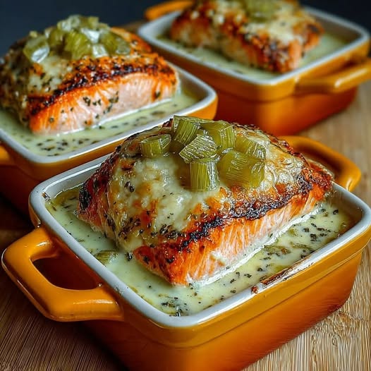 This baked salmon recipe combines the rich, tender flavor of salmon with a luxuriously creamy Boursin sauce infused with garlic, herbs, and a hint of lemon. It’s a Mediterranean-style dish that feels elegant but is simple enough for a weeknight. The salmon bakes to perfection while the sauce thickens and coats each fillet, creating a savory, tangy, and buttery topping. Fresh parsley adds brightness and a vibrant finish. Serve with roasted vegetables, steamed greens, or a light couscous for a complete meal.