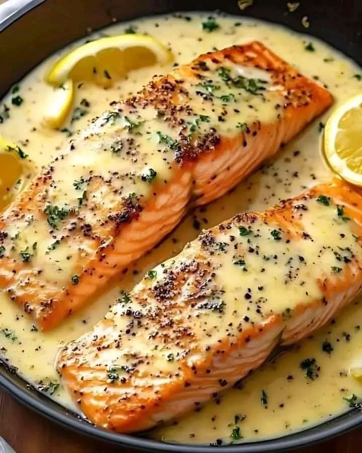This dish brings together tender salmon, fresh lemon and a smooth garlic cream sauce that tastes both simple and elegant. It’s fast, reliable and pairs with almost anything on the table. If you want, I can also give you a one-pan version or turn it into a pasta recipe.
