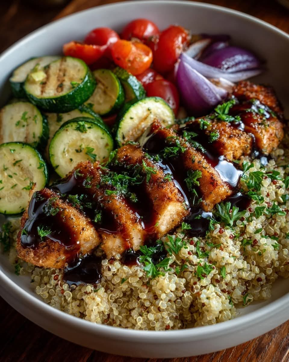 This Mediterranean-inspired meal features tender chicken breasts glazed with a sweet and tangy balsamic-honey sauce, served alongside a hearty quinoa and roasted vegetable medley. Zucchini, bell peppers, cherry tomatoes, and red onion add color, flavor, and nutrients, while quinoa provides a satisfying base. It’s a simple, balanced, and flavorful dish perfect for a weeknight dinner or meal prep.