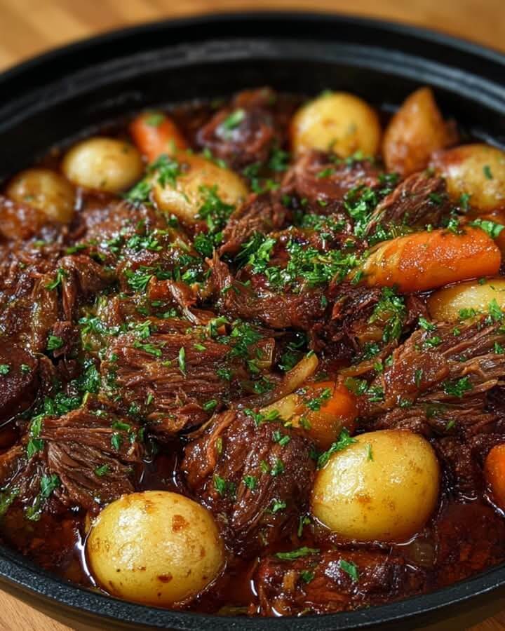A: Yes! After searing the beef and sautéing the vegetables, transfer everything to a slow cooker. Cook on low for 6–8 hours or high for 3–4 hours until the beef is tender.