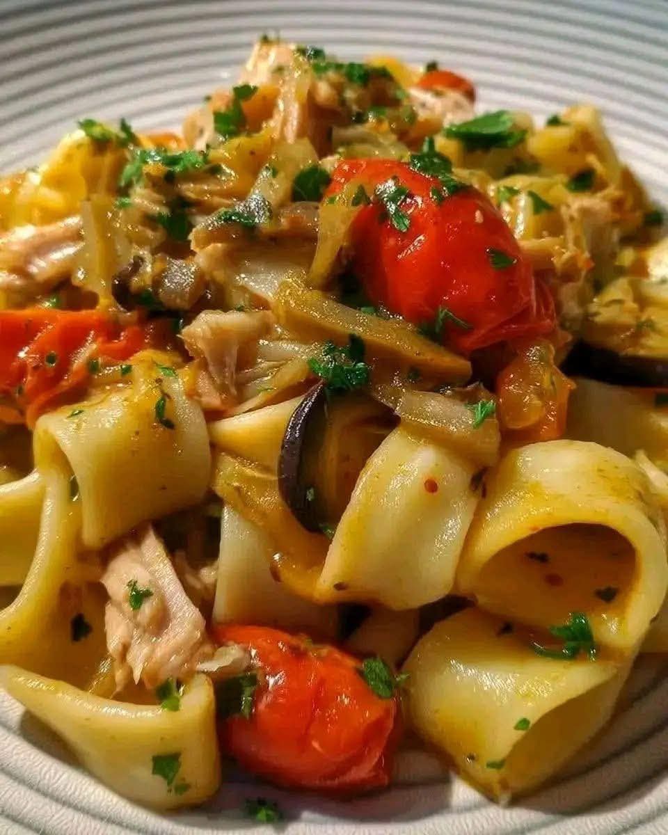 This Mediterranean Calamarata Pasta with Eggplant, Cherry Tomatoes & Fresh Tuna is a light yet satisfying meal that celebrates coastal Mediterranean flavors. The tender eggplant, sweet tomatoes, and perfectly seared tuna come together in a simple olive oil and garlic base that feels both elegant and effortless. Every bite is balanced—fresh, slightly spicy, and full of texture. It’s the kind of dish that tastes like summer by the sea, ideal for weeknight dinners or relaxed gatherings with a glass of chilled white wine.