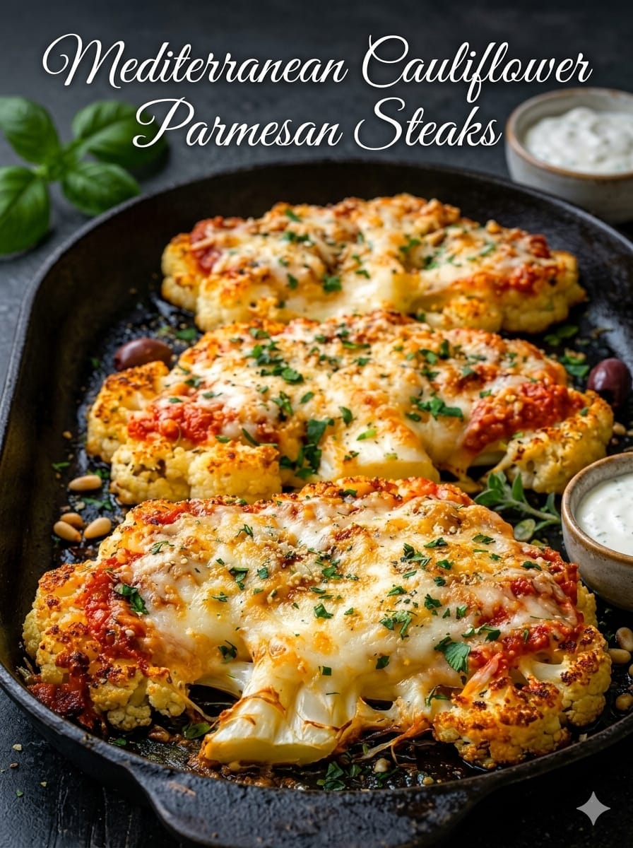 Mediterranean Cauliflower Parmesan Steak is a hearty, flavorful vegetarian dish that transforms a humble cauliflower into a satisfying main course. Thick “steaks” of cauliflower are roasted until tender and golden, then topped with rich marinara sauce and melted cheese for a comforting, Mediterranean-inspired twist on classic parmesan dishes. It’s wholesome, simple to prepare, and perfect for anyone looking for a lighter yet indulgent meal.