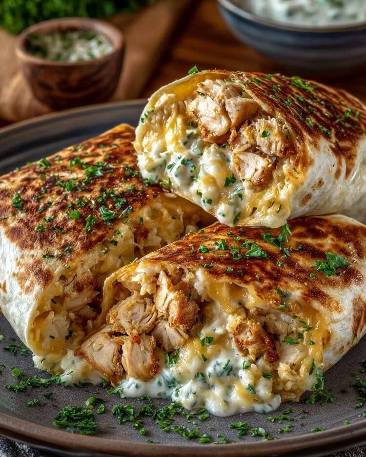 These Mediterranean Cheesy Garlic Chicken Wraps are a quick and satisfying way to enjoy a flavorful, melty handheld meal. The shredded chicken is wrapped up with gooey cheese, creamy touches, and fragrant garlic butter, all tucked inside a golden tortilla. They’re versatile enough for a weeknight dinner, a packed lunch, or even a hearty snack. You can keep them simple with just chicken and cheese, or elevate them with fresh vegetables for extra Mediterranean flair.