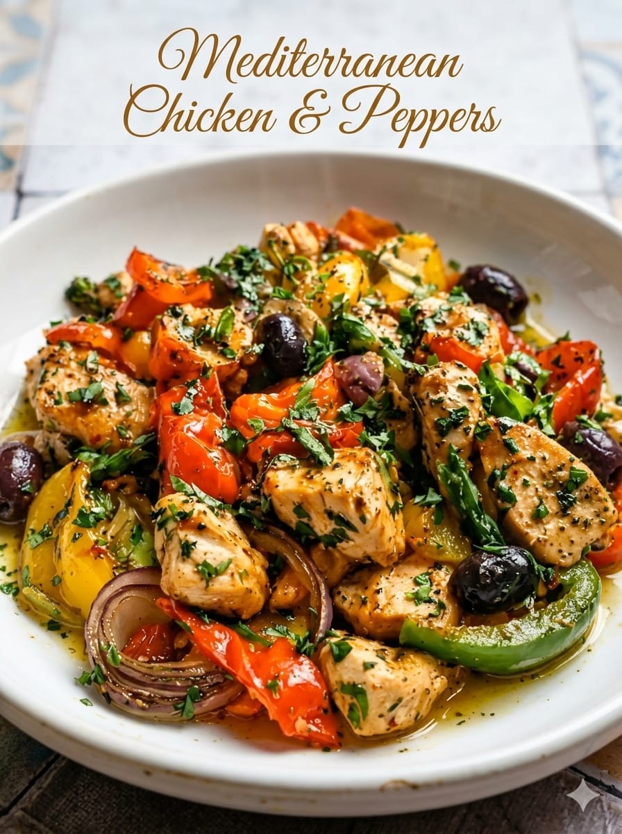 Mediterranean chicken and peppers is a colorful, flavor-packed skillet dish that brings together juicy chicken, sweet bell peppers, onions, olives, and fresh herbs in one simple meal. It’s inspired by classic Mediterranean cooking, where olive oil, garlic, lemon, and oregano do most of the heavy lifting. Everything cooks in one pan, making it perfect for busy weeknights while still feeling fresh, vibrant, and wholesome. It pairs beautifully with rice, couscous, or warm pita bread.