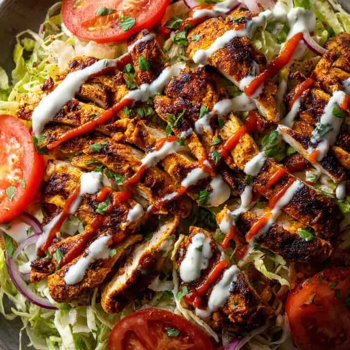 Mediterranean Chicken Salad Bowl with Garlic Yogurt and Harissa Drizzle
