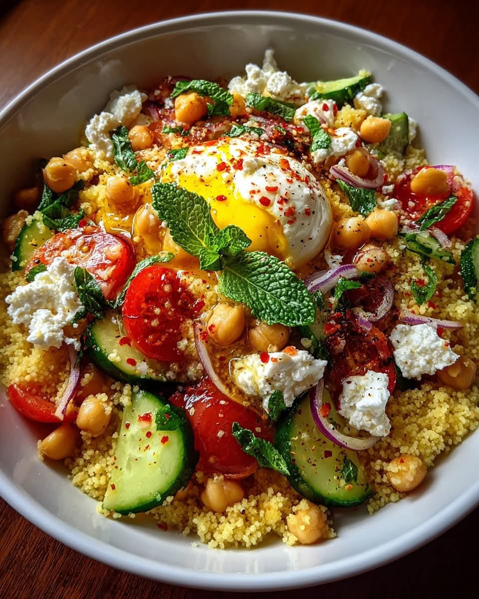 This Mediterranean Chickpea Couscous Bowl with Hot Honey Feta is a colorful, wholesome dish that brings together nutty couscous, protein-packed chickpeas, crisp veggies, and a spicy-sweet feta topping that ties everything together beautifully. It’s light but filling, refreshing yet bold — a perfect balance of textures and flavors. Great for lunch, dinner, or meal prep, it comes together in under 25 minutes and tastes amazing warm or chilled.
