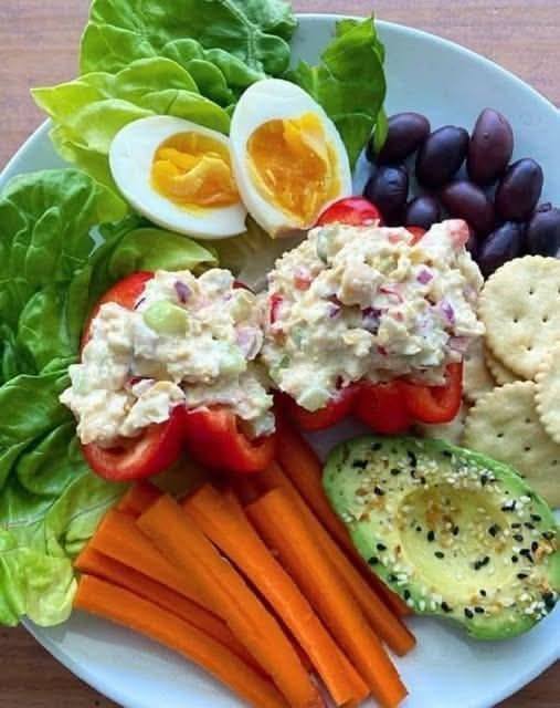 This Mediterranean Chickpea Salad Stuffed Peppers Plate is a fresh, vibrant, and nutritious meal packed with protein, fiber, and healthy fats. It’s perfect for a light lunch, meal prep, or a refreshing dinner option. The stuffed peppers provide a creamy and zesty chickpea salad, while the accompanying sides—avocado, soft-boiled egg, olives, and crunchy vegetables—offer a well-balanced mix of flavors and textures.